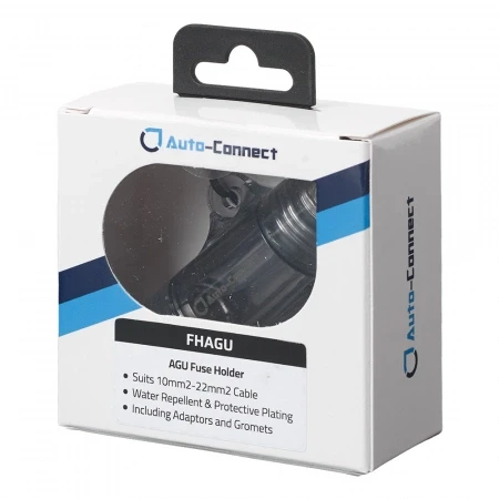 Auto-Connect FHAGU är en enkel men robust säkringshållare för AGU-säkringar, avsedd för bilinstallationer med högre strömkrav. Den passar 10–22 mm² kablage (8–4 AWG) och levereras med en adapter för 10 mm² (8 AWG). Konstruktionen är kompakt och behandlad för att stå emot fukt.